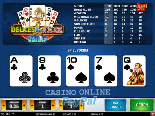 Der Online Casino und Mobile Casino Spieldesigner Play n Go hat viele deutsche Casinos, die er mit seinen Spielen ausstattet und die eine Ein sowie Auszahlung per PayPal ermöglichen. Weiter unten haben wir alle verschiedenen Video Poker Spiele samt Auszahlungsquoten und Jackpots für Sie aufgelistet.